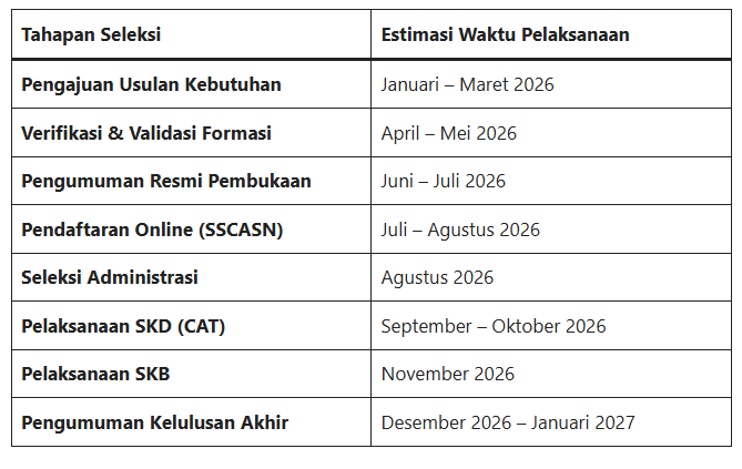 Berikut adalah estimasi jadwal tahapan seleksi CPNS 2026 jika mengacu pada siklus normal pemerintahan: